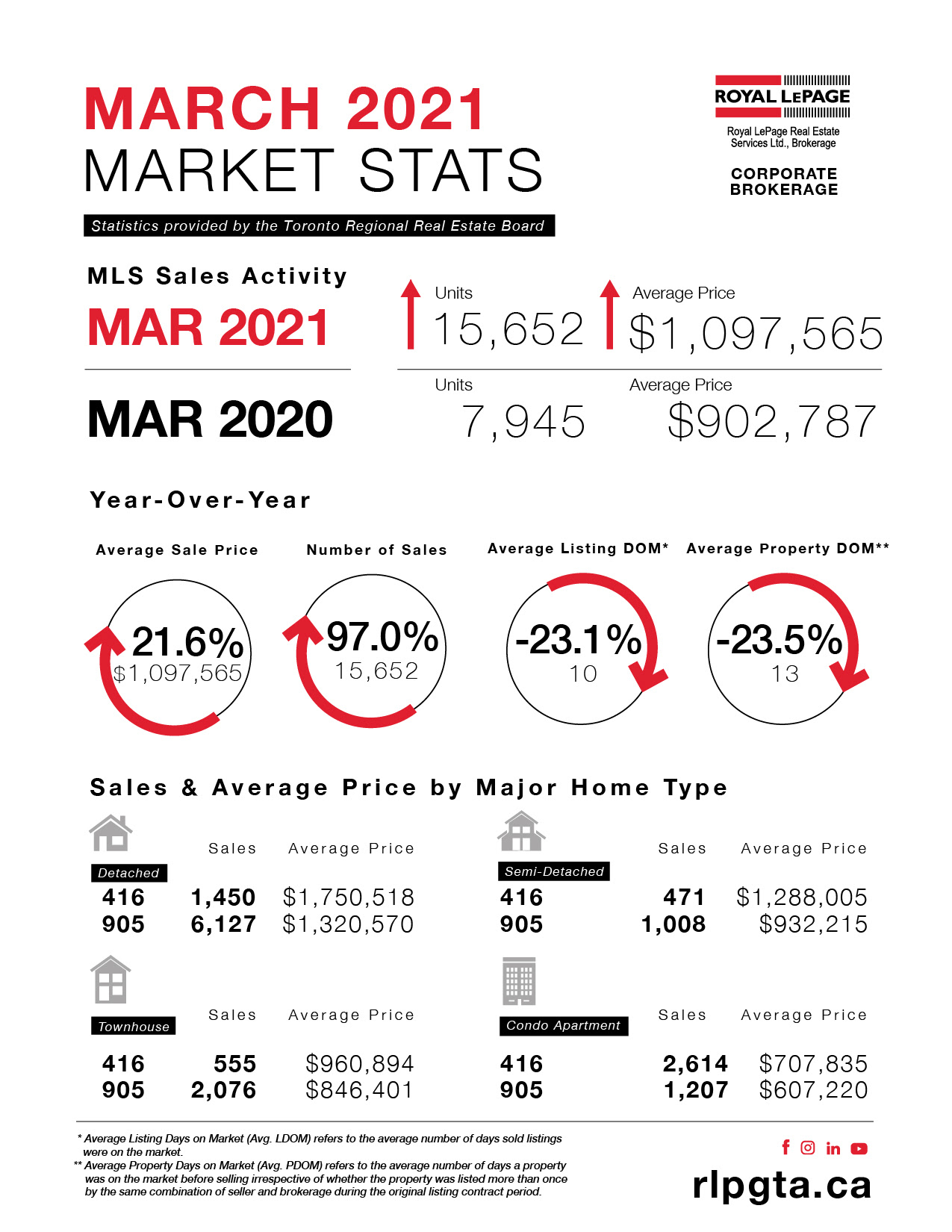 The first quarter of the 2021 GTA housing market consistently shows record sales numbers, price appreciation and market pace. Comparing March 2021 numbers with the same month last year is somewhat problematic given COVID-19’s market-halting impact mid-March 2020. Looking at the activity for the quarter, the story has solidly been about inventory and pace of sales. February 2021 reported a record fast absorption rate of only 3.5 weeks of inventory in the GTA. Despite a 57% increase in new listings coming on market, March 2021’s absorption was even faster. With an average of 3,612 units selling per week, there was less than 3 weeks of available inventory. Add on a five-year Days On Market low of 10 DOM, and the speed of the market has never been faster. If anyone is looking to sell, now is the time.